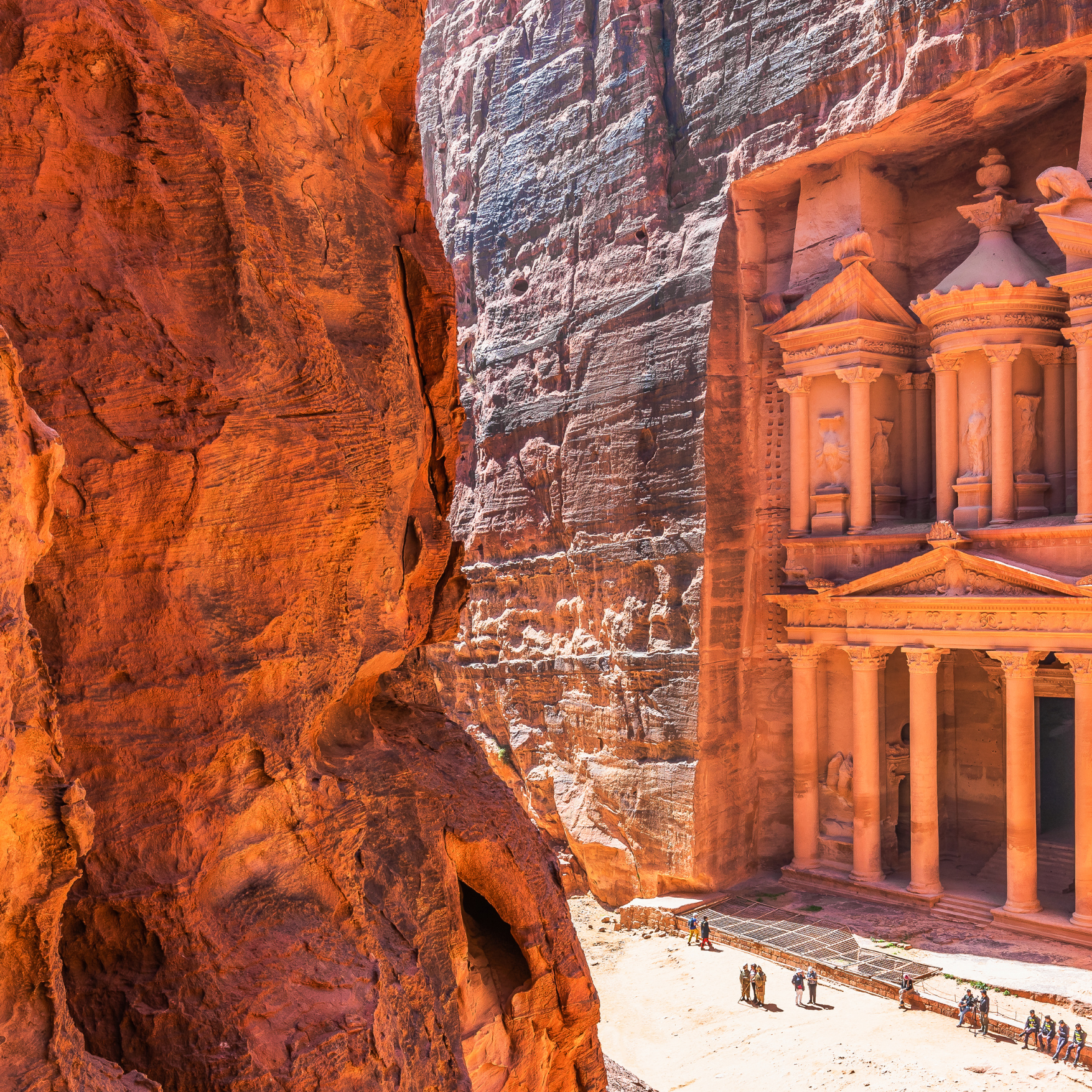El recorrido comenzará por la Tumba de los Obeliscos, continuando por el Siq, cañón de más de 1 Km de longitud tras el cual se descubre el Tesoro, una tumba colosal decorada con columnas y esculturas de un refinamiento y una belleza incomparables.